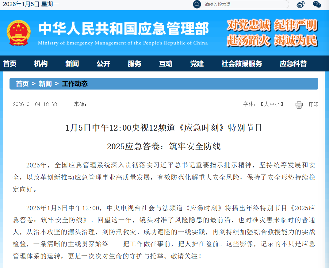 1月5日中午12:00央视12频道《应急时刻》特别节目 2025应急答卷:筑牢安全防线