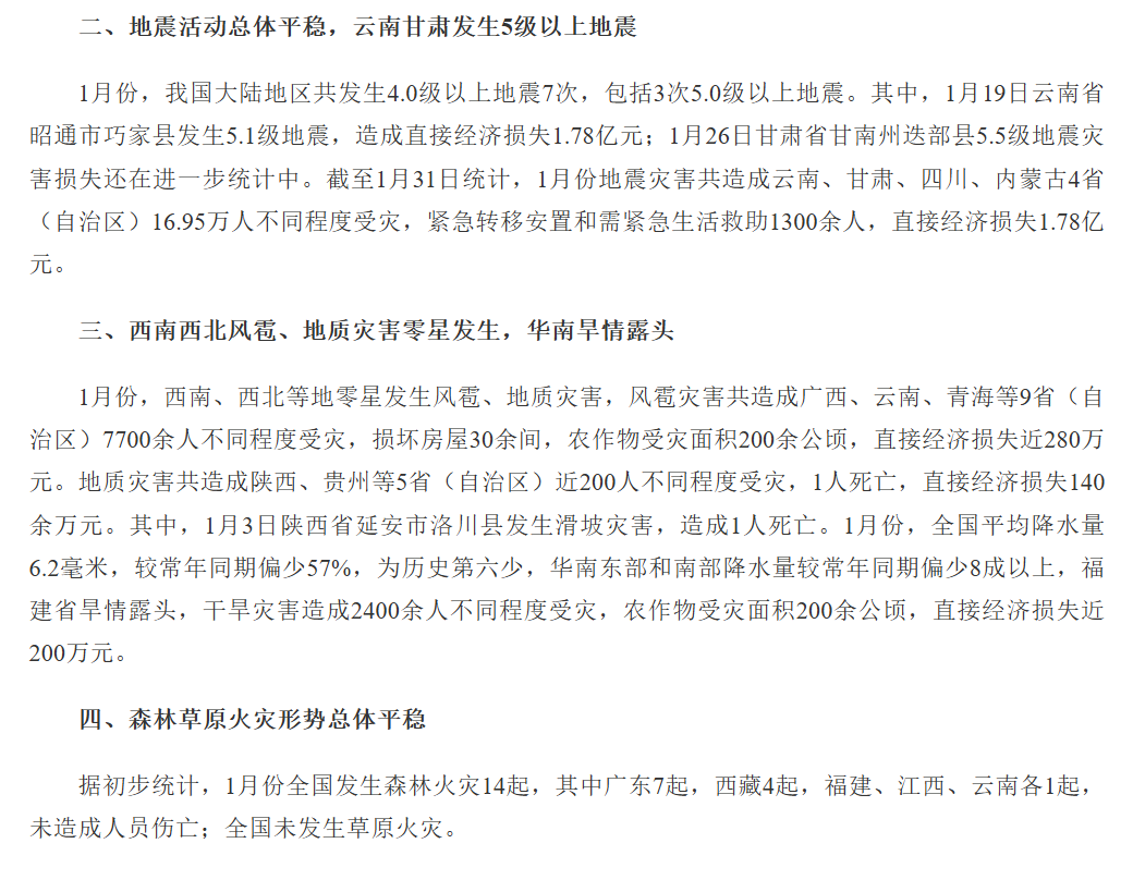 国家防减救灾委办公室 应急管理部 发布2026年1月全国自然灾害情况