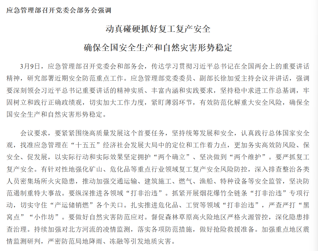 应急管理部召开党委会部务会强调动真碰硬抓好复工复产安全 确保全国安全生产和自然灾害形势稳定